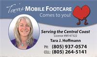 Tara's Mobile Footcare is a 'come to you' service for seniors, diabetics, victims of degenerative diseases and disorders, and anyone else who can't reach their feet. Your foot care service is provided in the privacy/comfort of your own home, rcfe, hospital, extended care, basically anywhere in the state of CA. Thick nails and diabetes are 'no problem.' My clients come from friends referring friends, podiatrists, caregivers, salons, and the Chamber, of course! I have been in business since 1995, and presently travel from Goleta to Cayucos and beyond. I'm licensed and insured as a mobile nail tech, and am a graduate and valedictorian of the Hancock Medical Assisting Class of 2002. Feel free to give me a call about your loved ones foot care!